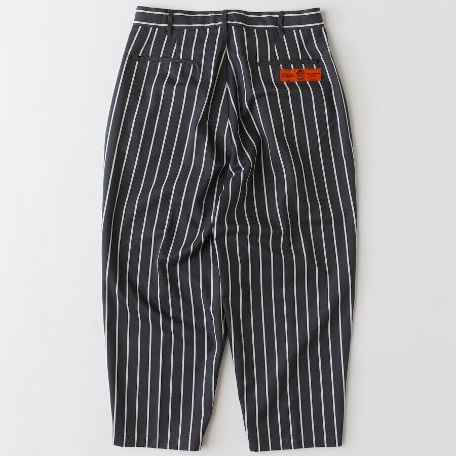 ワークテイストあふれるT/Cストライプを使用し、ヒップから膝にかけてボリュームを持たせたワイドテーパードに加え、ジャストレングスによる独特なシルエットが魅力。