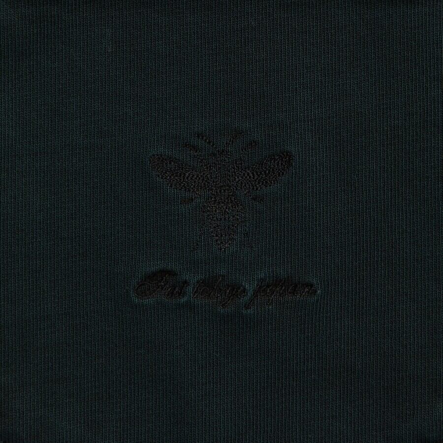 胸ポケットの刺繍、裾のブランドネームが程よいアクセントに。