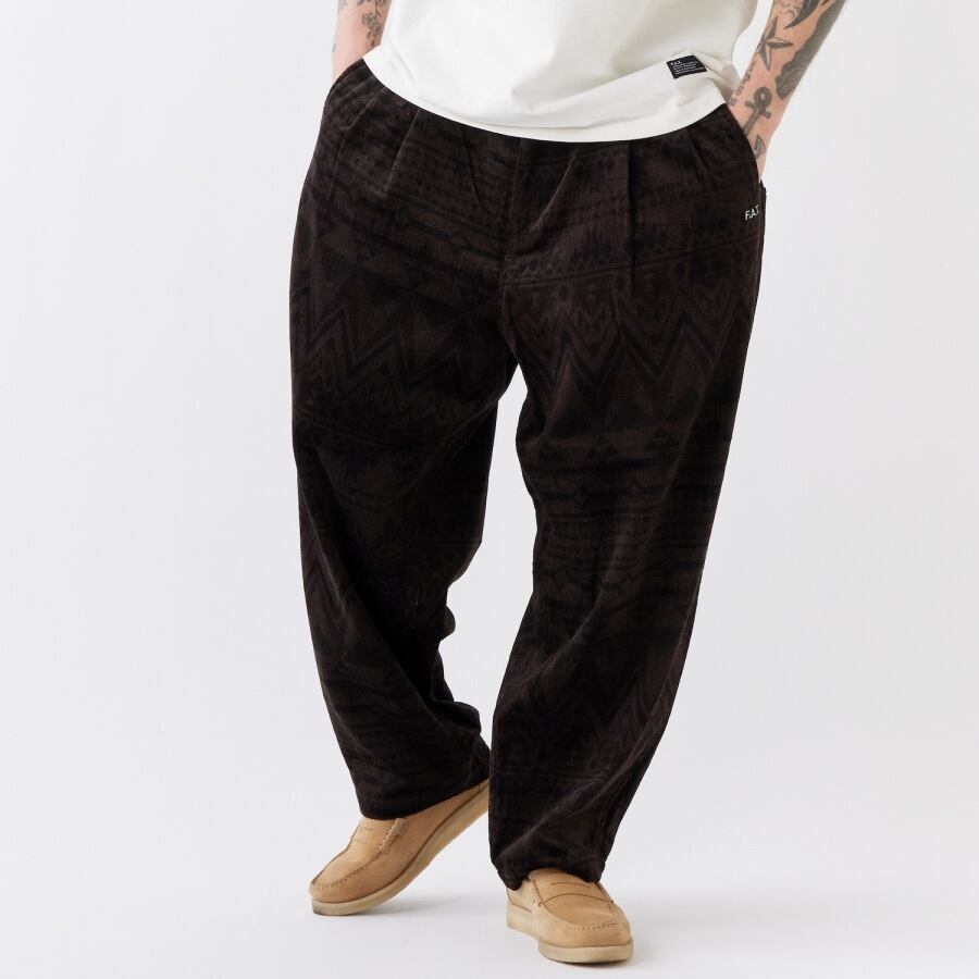 絶妙なダークトーンのネイティブプリントが印象的なコーデュロイ素材を使用したワイドパンツ。股上を深くし、渡りを広くとることによりヒップから膝にかけてボリュームを持たせたワイドテーパードに加え、ジャストレングスによる独特なシルエットが魅力。穿き心地の良さはもちろんのこと、ドローコードを備え、ベルトレスでイージーパンツとして着用可能。フロントのロゴ刺繍とバックのブランドネームがさり気なく主張してくれる。