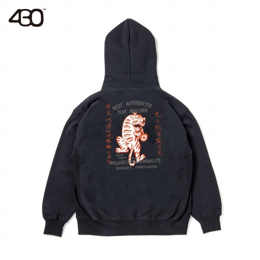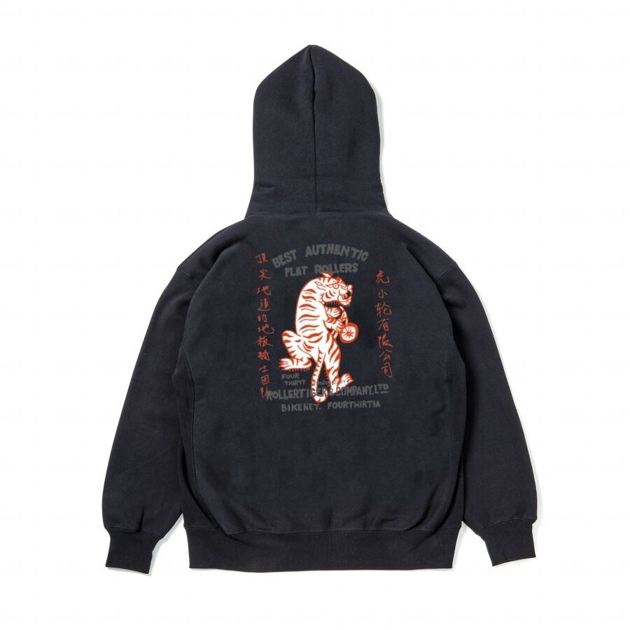 架空のチャイニーズBMX会社rollertiger社のパーカー。漢字で書いてあるのは左側がbest authentic flat rollers、右側がrollertiger社のプリントです。