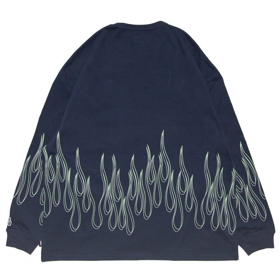 ピンストライプで構築された、重なり合うフレイムスが印象的な LS Tee。2 層に配置されたフレイムス柄は、それぞれ異なるギミックを採用。暗闇で光を放つ蓄光プリントと光を反射するリフレクタープリント。昼夜で異なる表情を演出する。シンプルな中に遊び心とインパクトを落とし込んだ一枚です。