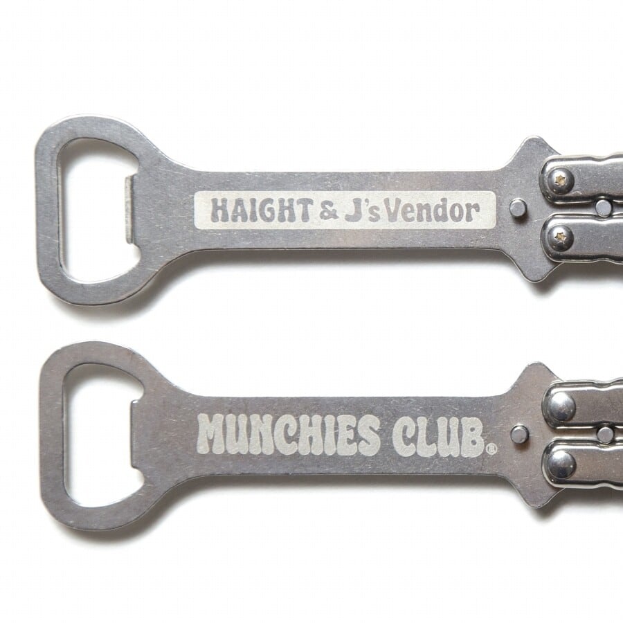 原宿のチキンオーバーライスの名店 "J’s Vendor" とのコラボプロダクト「MUNCHIES CLUB」。バタフライナイフ風ギミックで魅せるボトルオープナー。実際にはナイフではなく、開閉ギミックを楽しめるボトルオープナーとして仕上げた遊び心満載のアイテム。栓抜き部分にはレーザー刻印でMUNCHIES CLUBのロゴ、裏面にもレーザー刻印でデザインが入る。アウトドアやホームパーティーでの話題作りにぴったりな、カルチャーとユーモアを両立したアイテム。