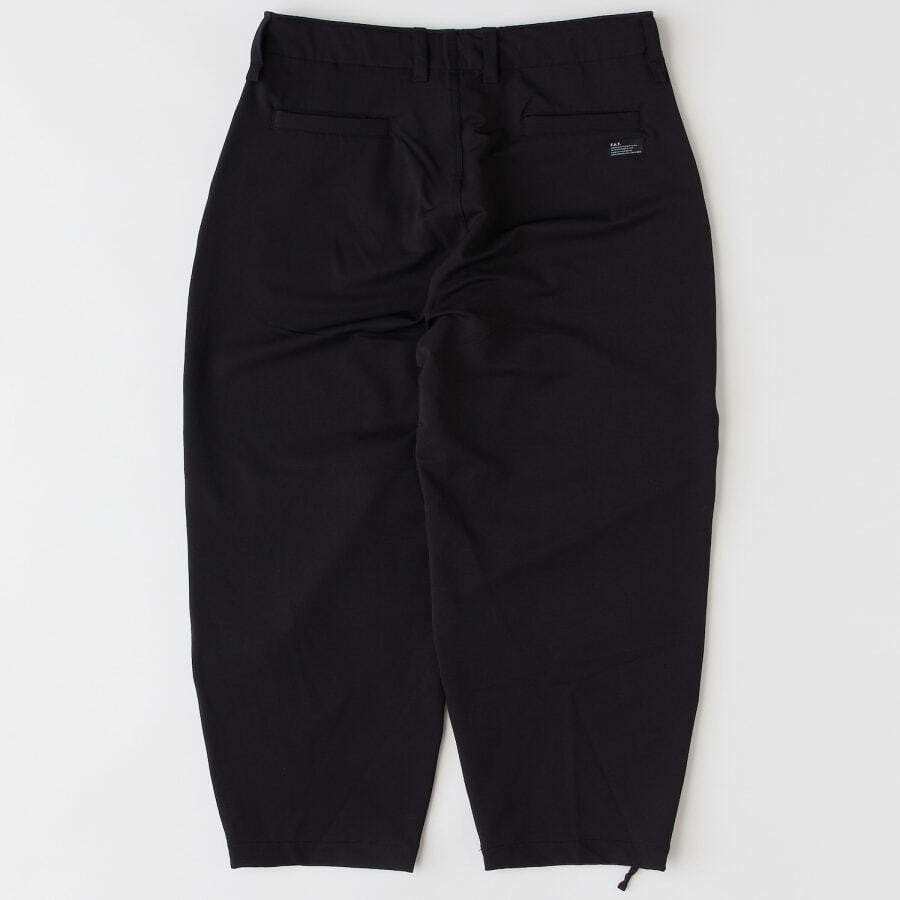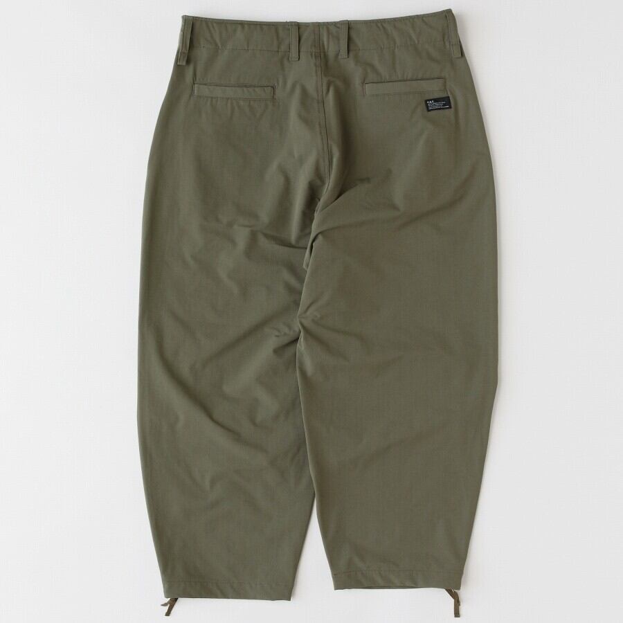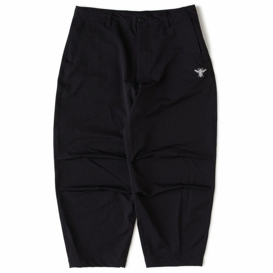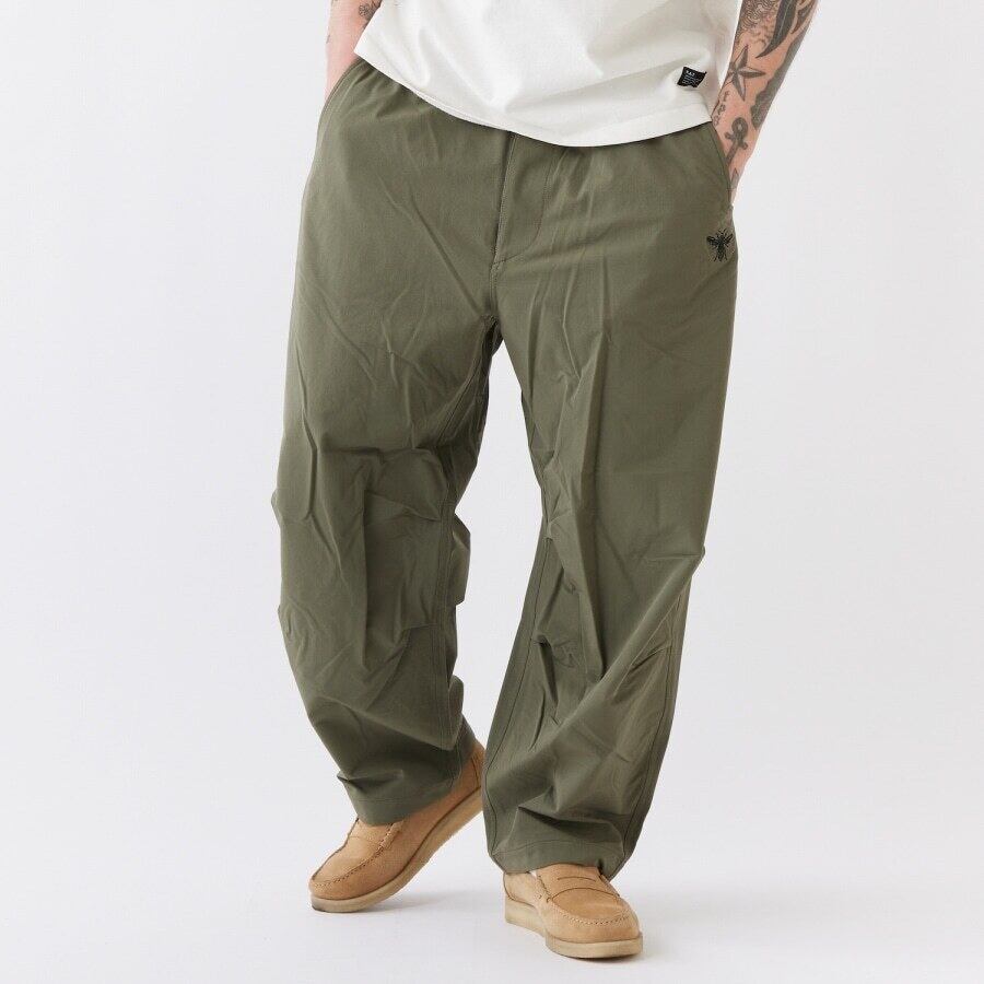 伸縮性の高いナイロンストレッチ素材を使用したワイドパンツ。股上を深くし、渡りを広くとることによりヒップから膝にかけてボリュームを持たせたテーパードラインに加え、ニータックを入れることで、よりボリューム感のある独特なシルエットが魅力。裾ドローコードを絞ってシルエットを変化させて楽しみたいアイテム。フロントの刺繍とバックのブランドネームが程よいアクセントに。