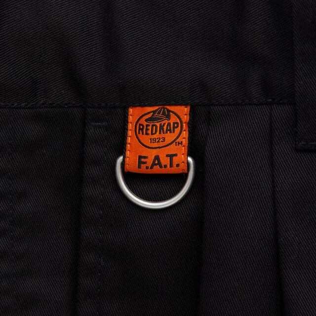 RED KAP×F.A.T.のコラボレーションによるワイドチノタイプパンツ。洗いのかかった柔らかなT/Cツイルを使用し、ヒップから膝にかけてボリュームを持たせたワイドテーパードに加え、ジャストレングスによる独特なシルエットが魅力。穿き心地の良さはもちろんのこと、右フロントのネームループにDリングを備えキーホルダーやカラビナを装着可能。ポケット下のロゴ刺繍、バックのネーム、ドローコード先端のロゴプリントなどこのコラボのためだけのデザインディテールも魅力。