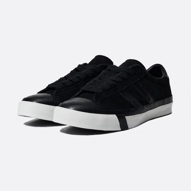 " スニーカー" という言葉を世に広めたアメリカの老舗シューズブランド<Keds>がプロスポーツユース向けに展開した1949 年生まれの<PRO-Keds>。アイコンの1 つであるROYAL PLUS(ロイヤル プラス)は1972 年に発表され、アッパー側面の2 本ラインとソール側面に配したレッド&ブルーのパワーストライプの装飾が特徴となったモデル。そして、現代的なアプローチでアーカイブの魅力を新たに提案する日本発信プロジェクト「Neo PRO-Keds」によって再構築されたこの復刻バージョンは、路面状況を選ばず高いグリップ力を発揮する「Vibram?? MEGAGRIP」のオリジナルソールを搭載して機能面をアップグレード。ヴィンテージのディテールを追求しながら進化を遂げたオールドスクールスタイルの新定番をベースとした本作は「ベーシック+αの落とし込み」をコンセプトに掲げる2008 年設立の東京発ブランド<CLUCT(クラクト)>と『mita sneakers』がチームアップした三者によるコラボレーションモデル。毛足の短い上質なスウェードをベースに高級感を演出するオーストリッチ調の型押しレザーをあしらい、ヒールにはシンボリックなツバメの刺繍と同ブランドのピスネームをプラス。加えて、シルエットを引き立てるホワイトのサイドウォール以外のパーツをオールブラックでまとめ、無骨な印象の無彩色で構成しながらも、立体的なコントラストで魅せる逸足に昇華。