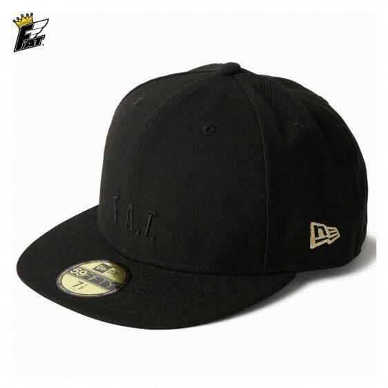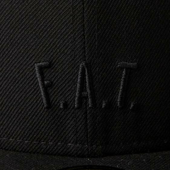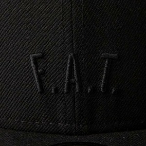 表地やツバ裏など全体をBLACKで統一し、フロントには3D刺繍によるFATロゴ、サイドのNEW ERAフラッグロゴをGOLD刺繍で施した。
