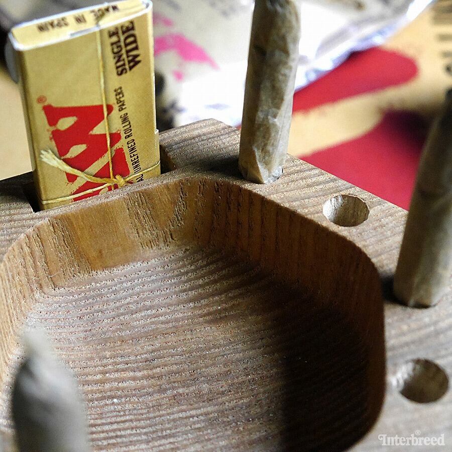 六角型の灰皿は国産ウッドを削り出して制作した高級感溢れる1品で、中心のくり抜き灰皿部分のほか、外周を囲うように手巻きタバコを8本ストック出来るホール、シングルサイズのRAWペーパーを差し込めるポケットなど、ハンドメイドならではの機能的な造りとなっています。