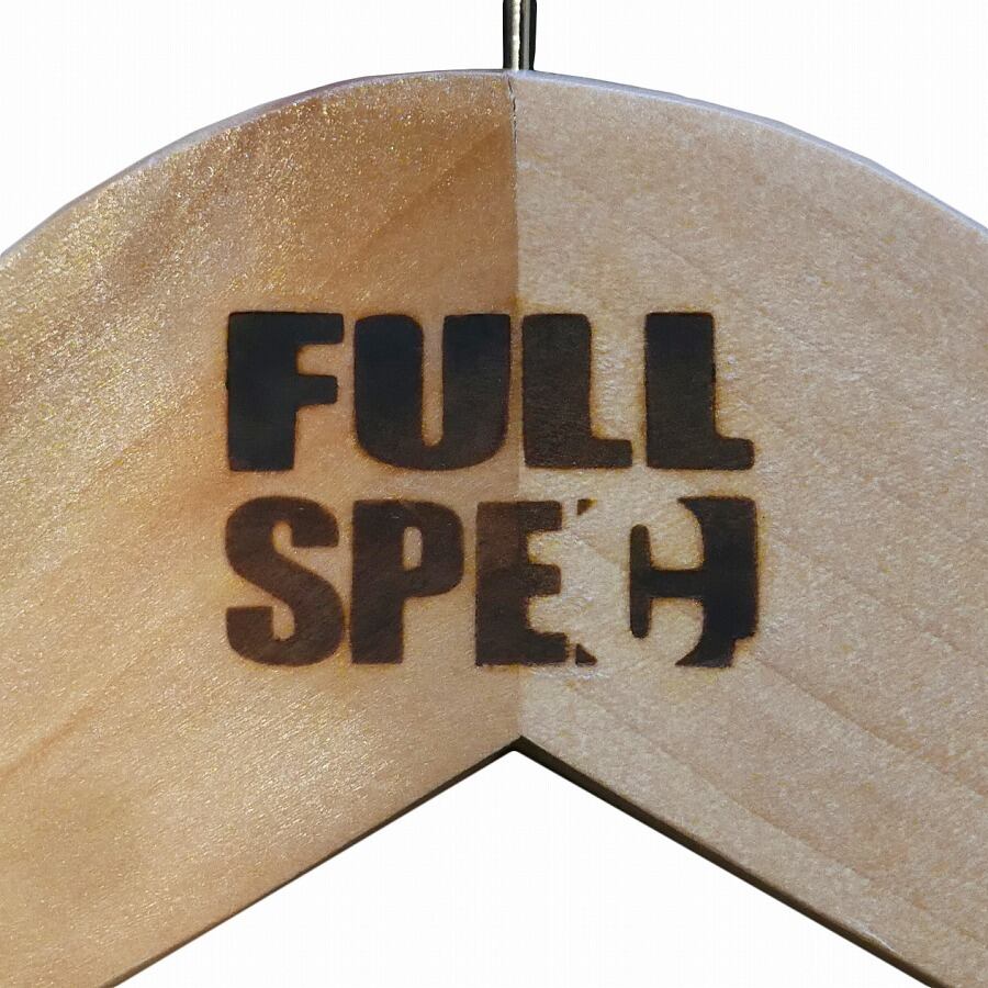 FULLSPEC.のロゴを焼印で配した天然木のオリジナルハンガー。