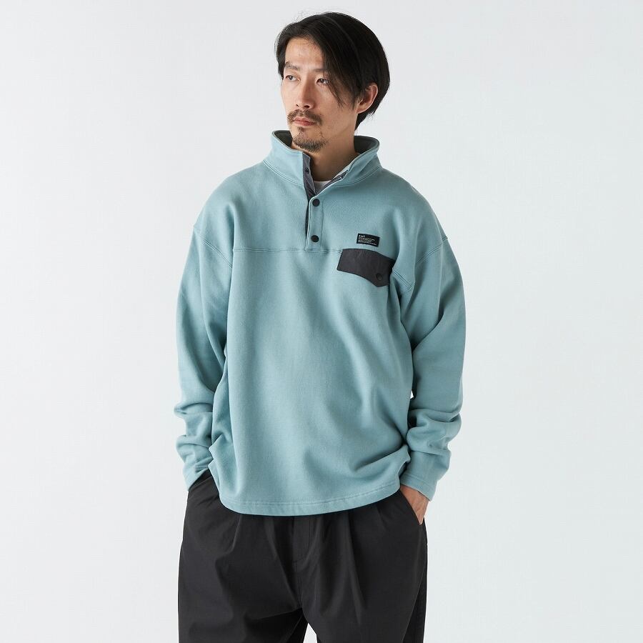 シンプルなスタンドカラーデザインのプルオーバースウェットは、フロントのスナップボタンと胸ポケットがアクセントになり、1枚で着てもよし、シャツをインナーに合わせるなど様々なコーディネートで活躍してくれるアイテム。