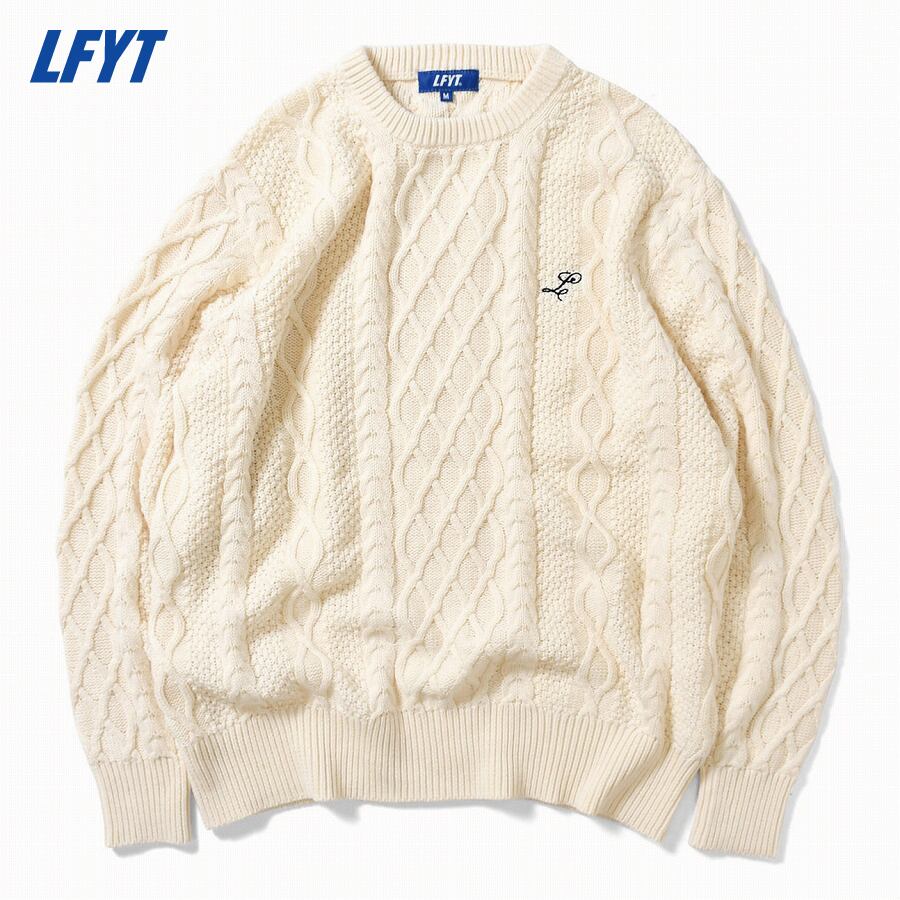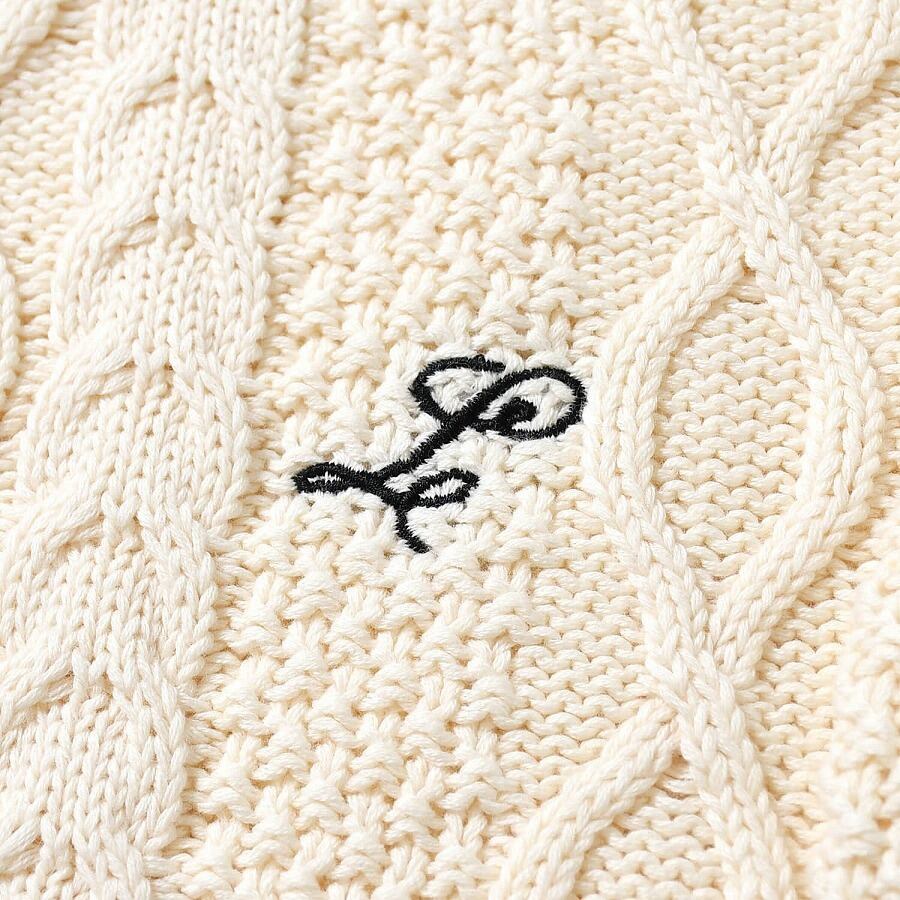 Lのワンポイント刺繍を施したクラシックなケーブル編みローゲージニットセーター。