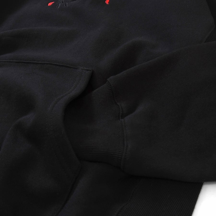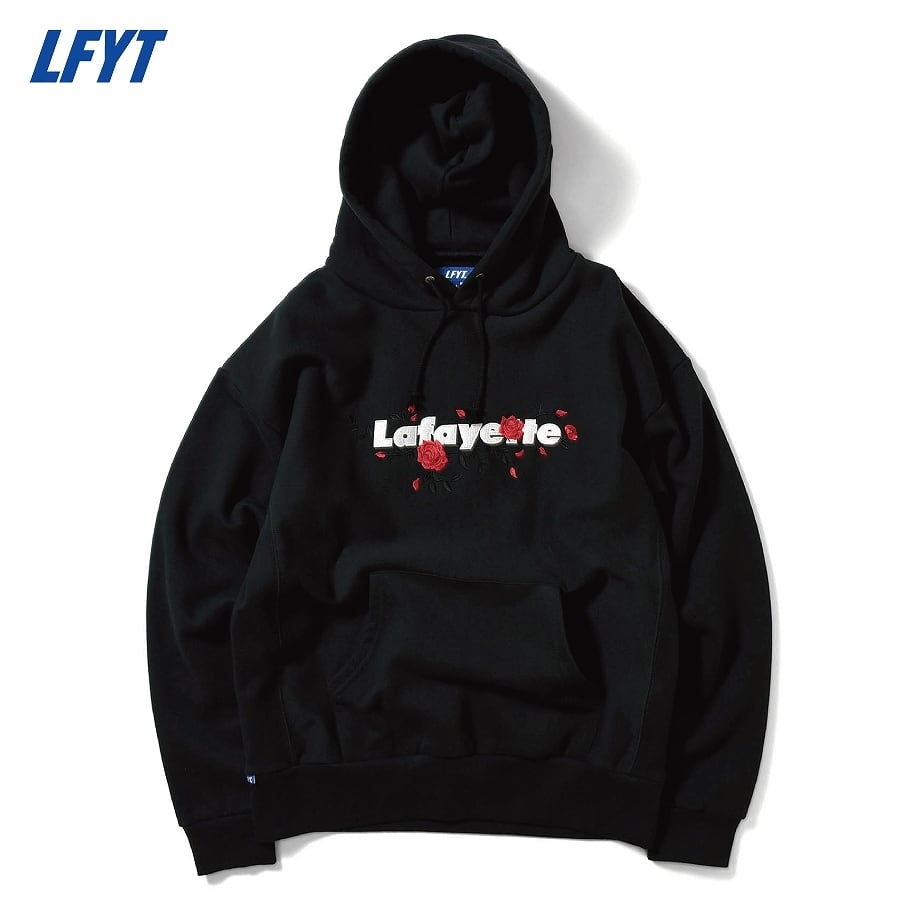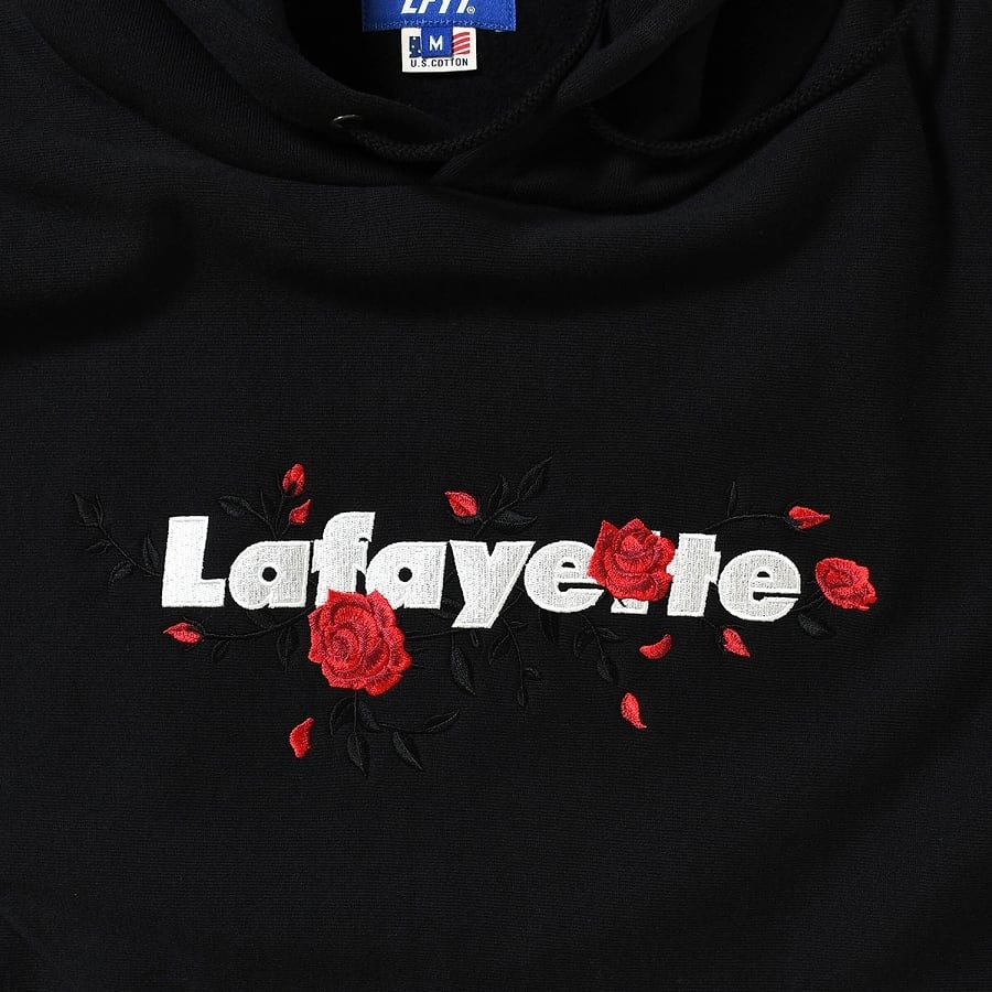 Lafayetteのコアロゴとローズの刺繍をバランスよく配したUSコットンボディのプルオーバーフーディ。