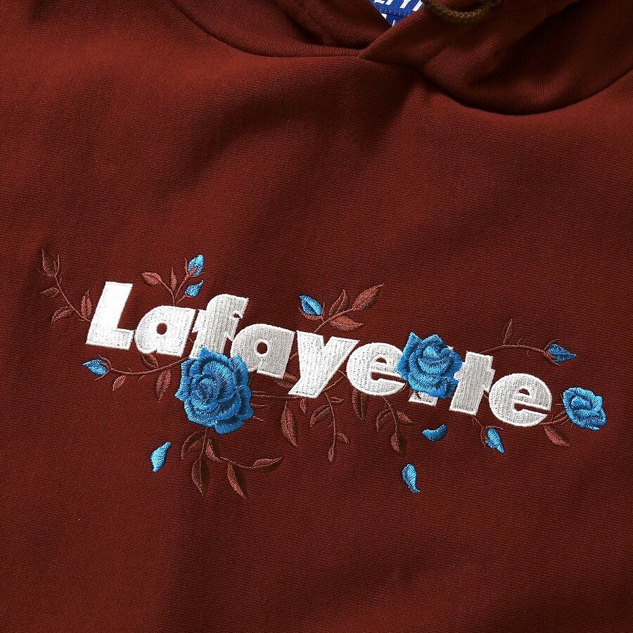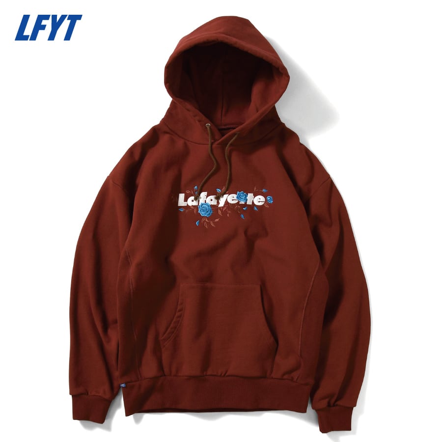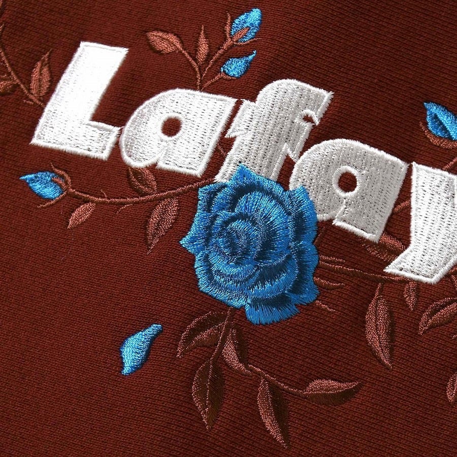 Lafayetteのコアロゴとローズの刺繍をバランスよく配したUSコットンボディのプルオーバーフーディ。
