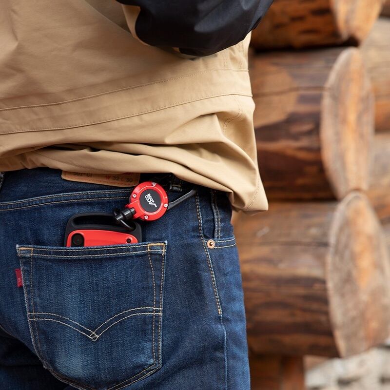 リュックや登山ザック・バッグ・ベルトループなどに取り付け、リール内から伸縮自在なコードを伸ばすことでカラビナリール(キーリール)やピンオンリールとして、使いたいときにスマートにアイテムを手元で使うことができます。