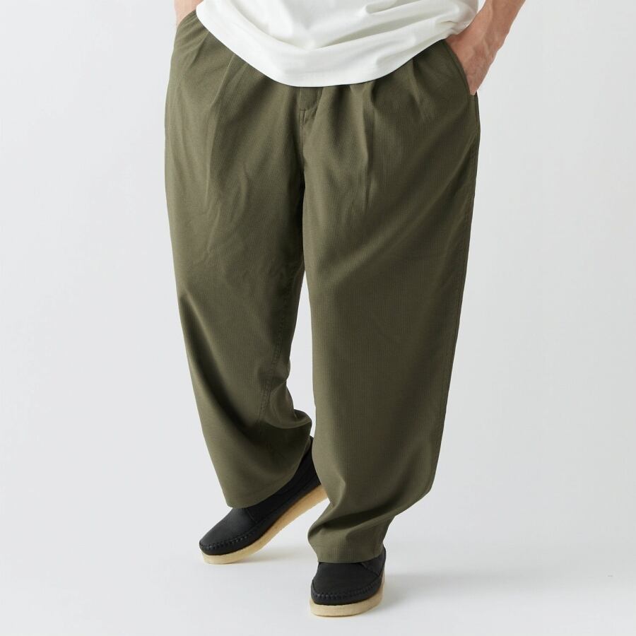 程よいドレープ感とのシャリ感が印象的なシアサッカー素材を使用したワイドパンツ。