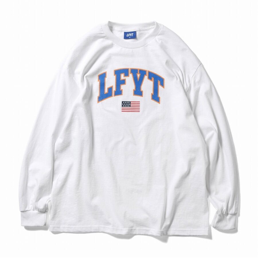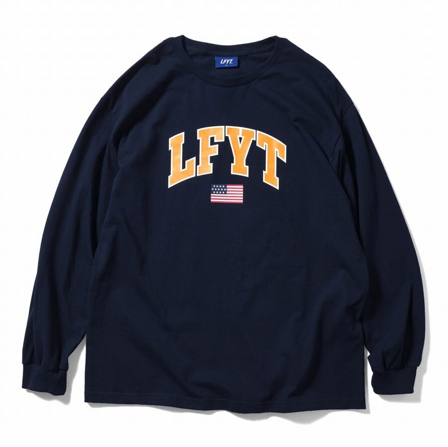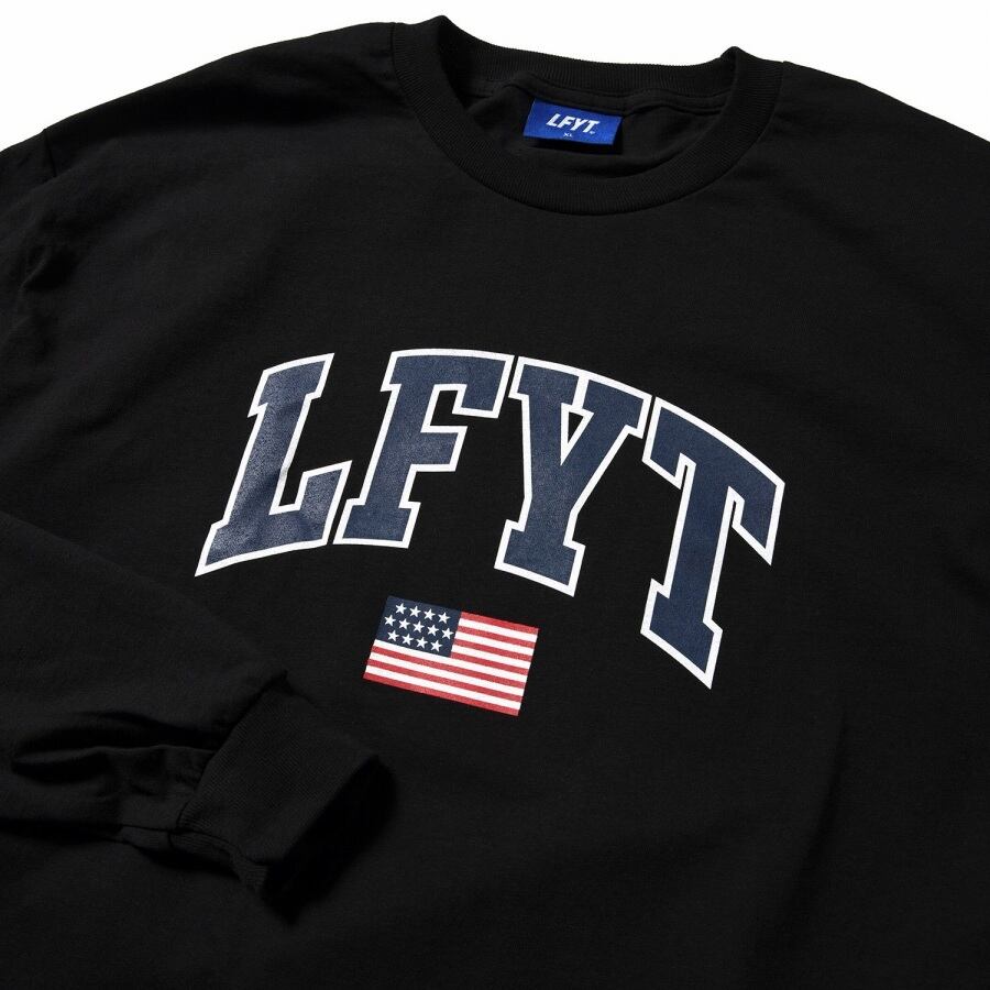LFYTアーチロゴに星条旗を掛け合わせたデザインのロングスリーブTシャツ。