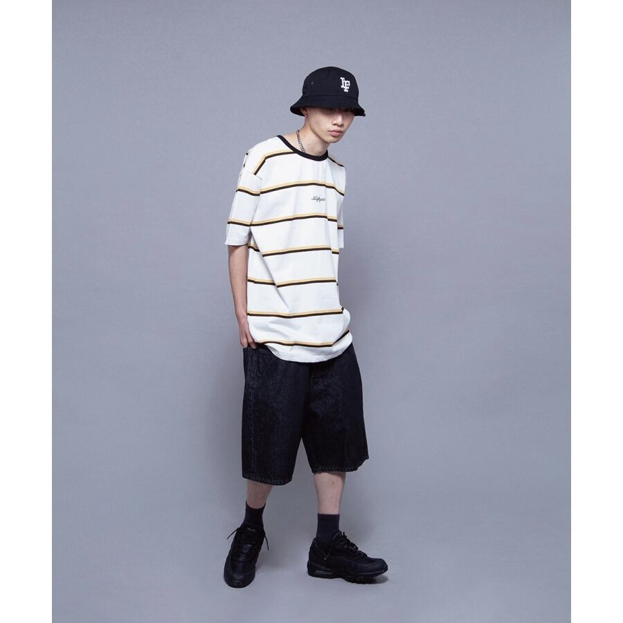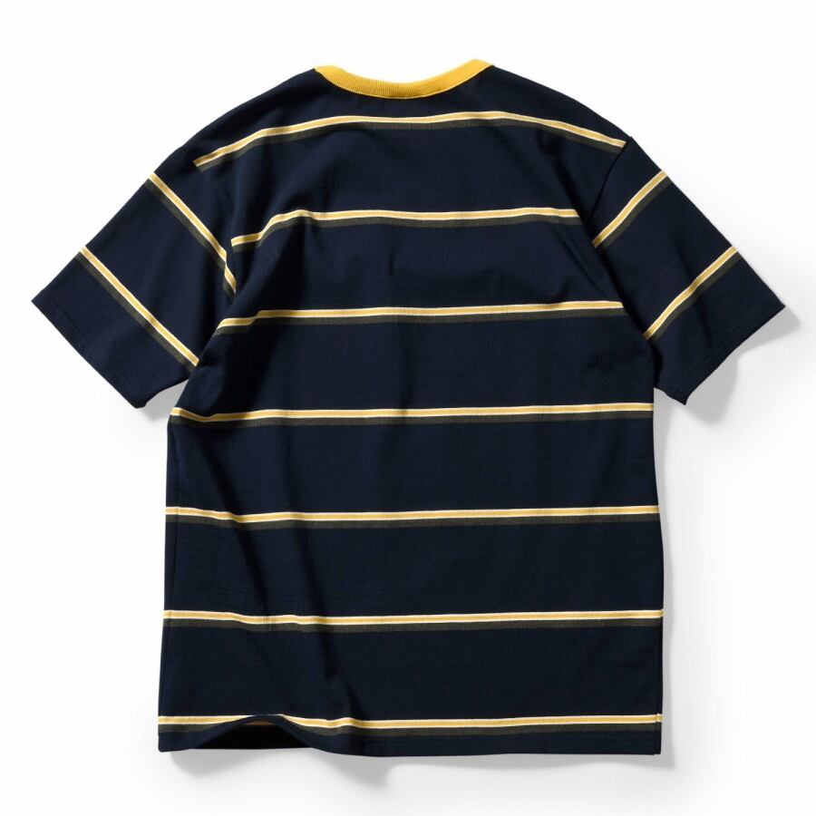 差し色による程よいアクセントの利いたマルチボーダーパターンのポケットTシャツ。