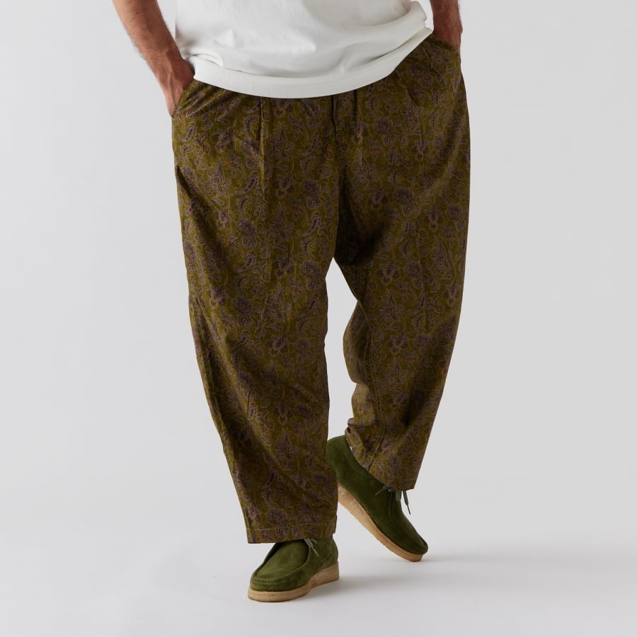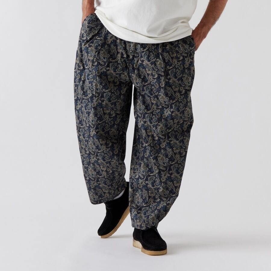 独特なカラーリングのペイズリーブロードを使用したワイドパンツ。