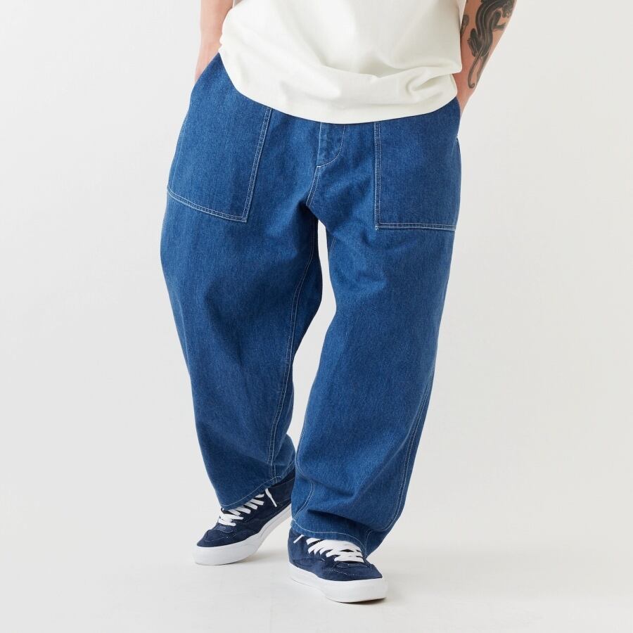 ヒップから膝にかけてボリュームを持たせたワイドシルエットに加え、ジャストレングスはどんなスニーカーとも絶妙なバランスで合わせられる。