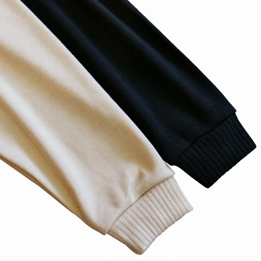 こちらの素材はバルキー性のあるアクリル/ウールの混紡糸をしっかりと編み立てており、ボリューム感と軽量感を併せ持っています。