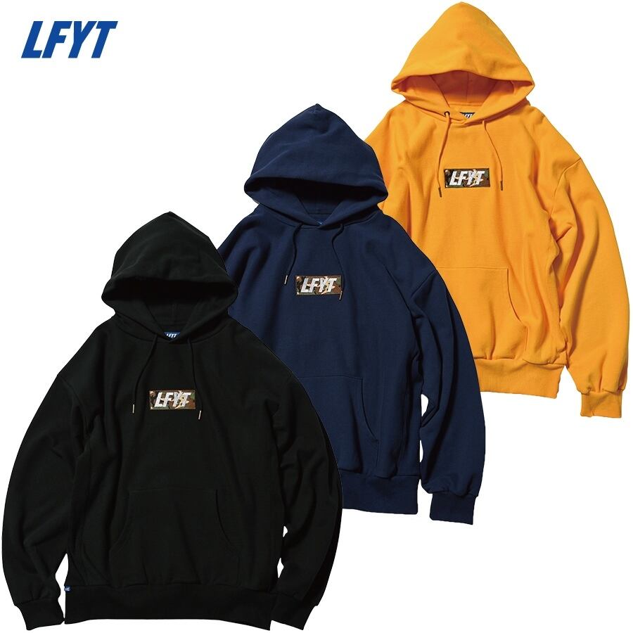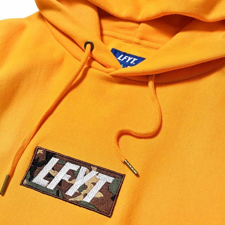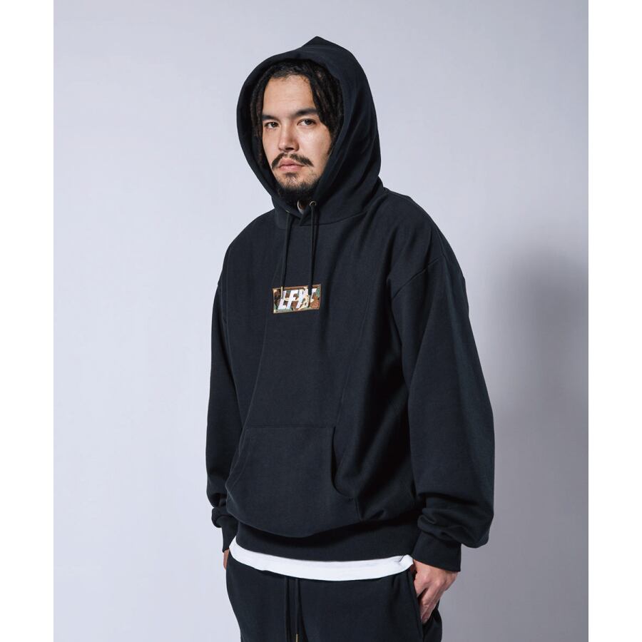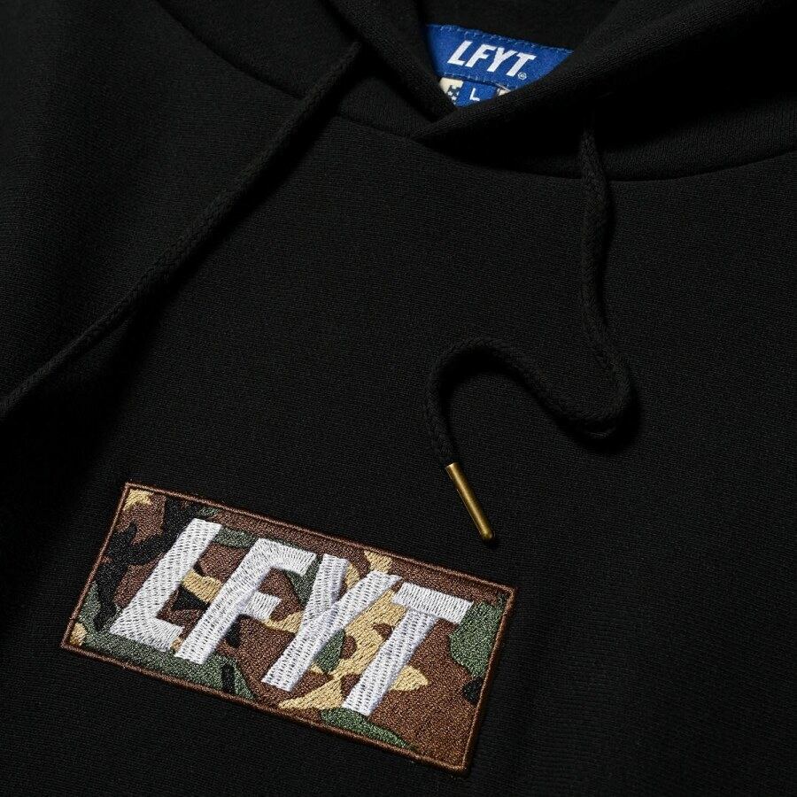 ブランドの代表的なロゴであるLFYTボックスロゴにオリジナルカモパターンを高密度な刺繍で配したシンプルなプルオーバーフーディー。