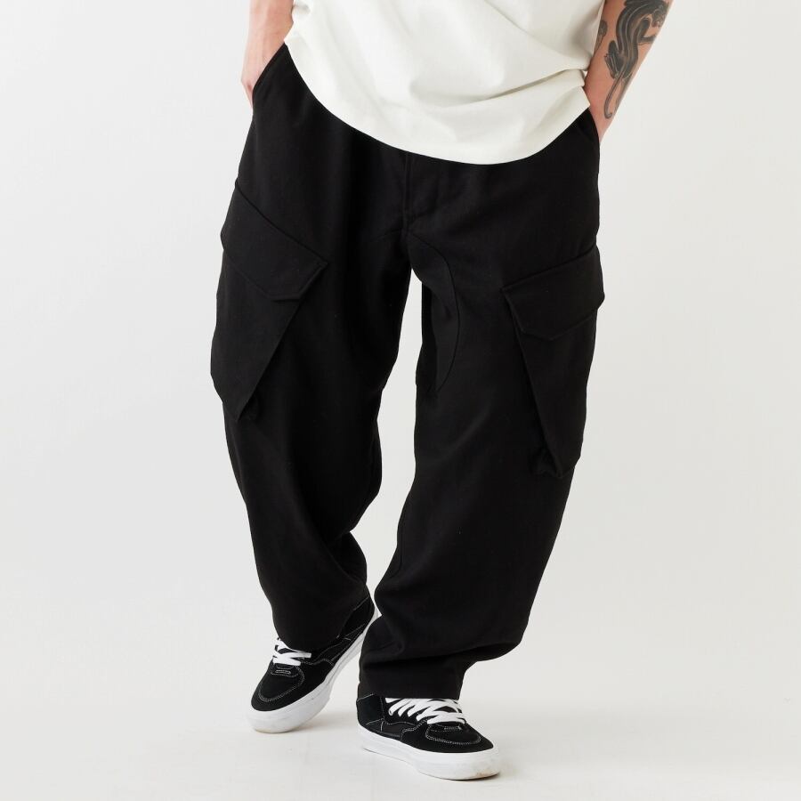 股上を深くし、渡りを広くとることによりヒップから膝にかけてボリュームを持たせたワイドテーパードシルエットに加え、ジャストレングスによる独特なシルエットが魅力。