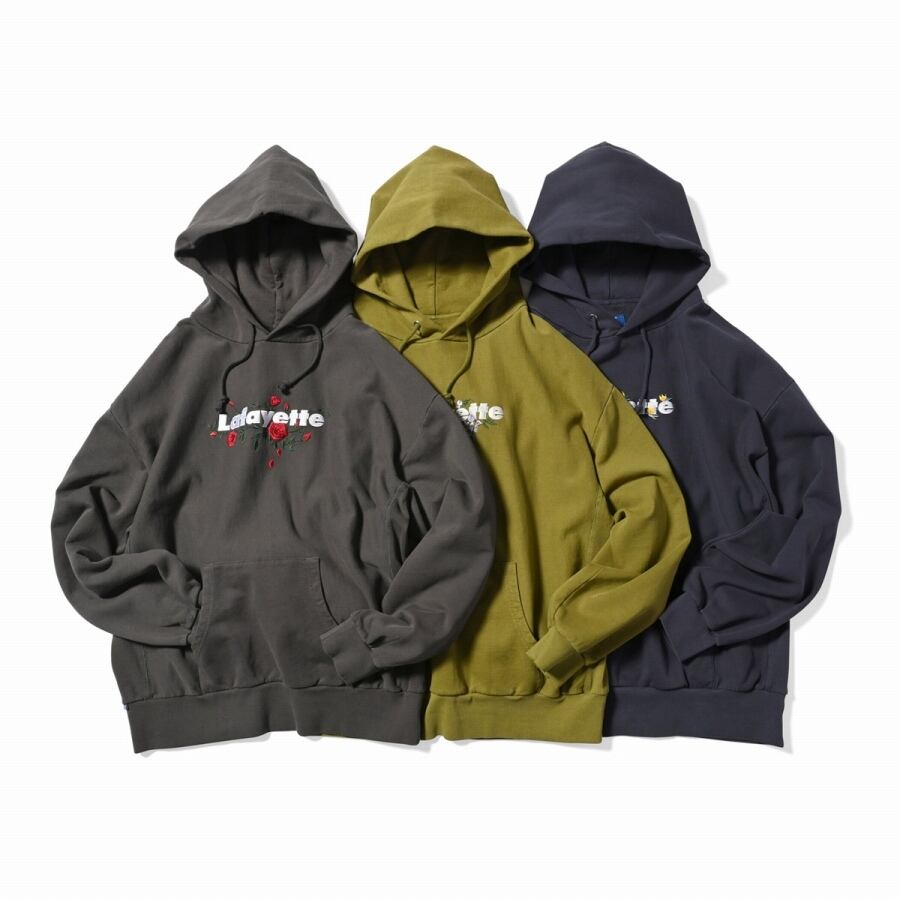 Lafayetteのコアロゴとウィステリアの刺繍をバランスよく配したUSコットンボディのプルオーバーフーディ。
