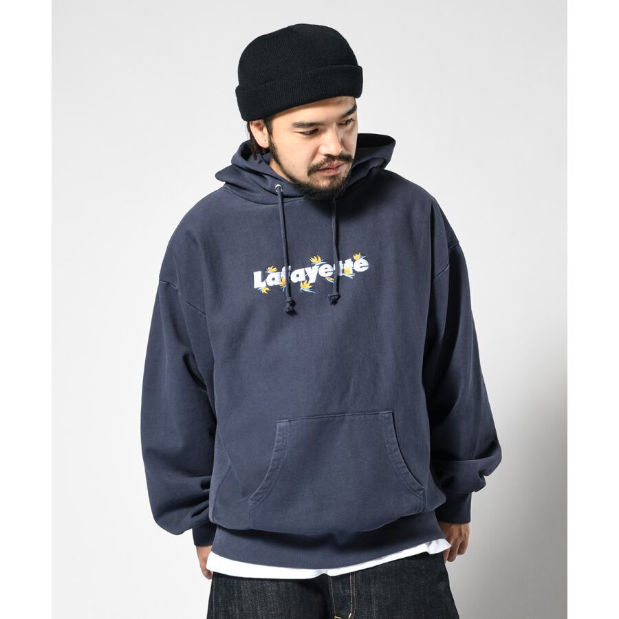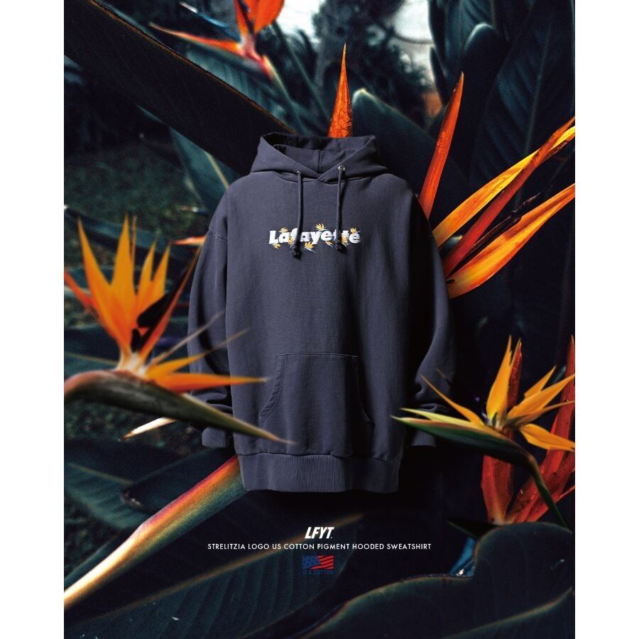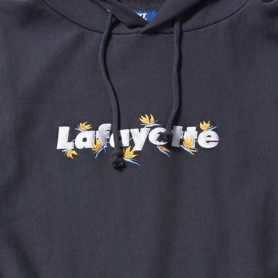 Lafayetteのコアロゴとストレリチアの刺繍をバランスよく配したUSコットンボディのプルオーバーフーディ。