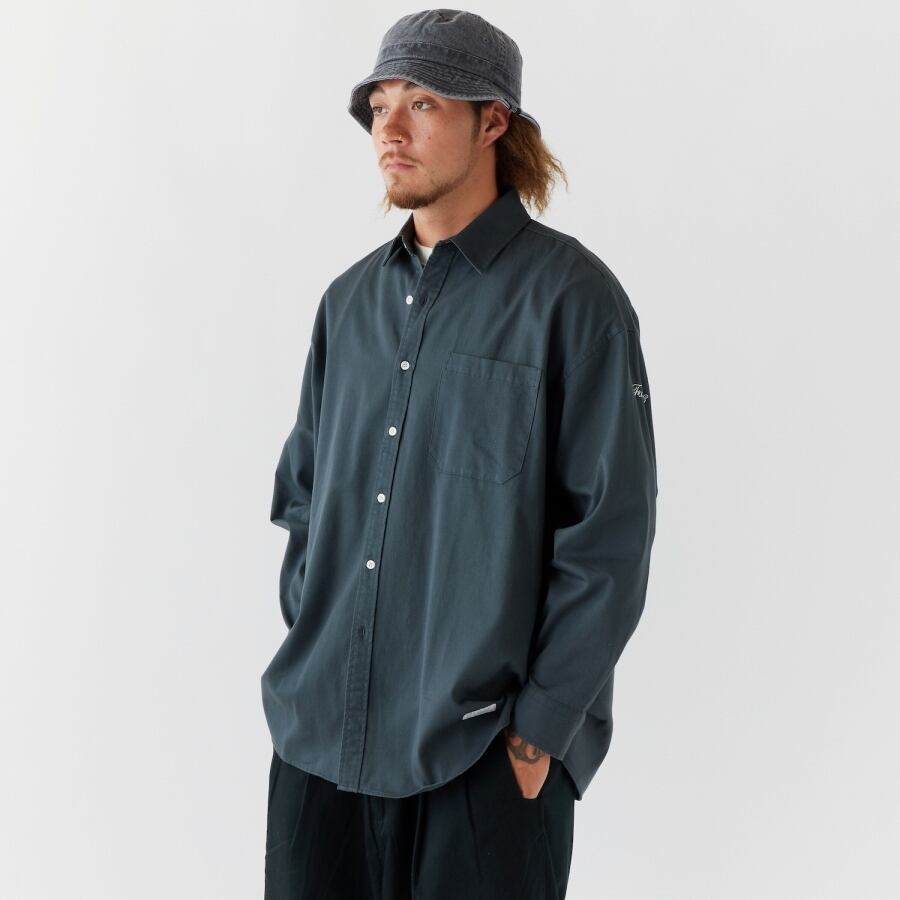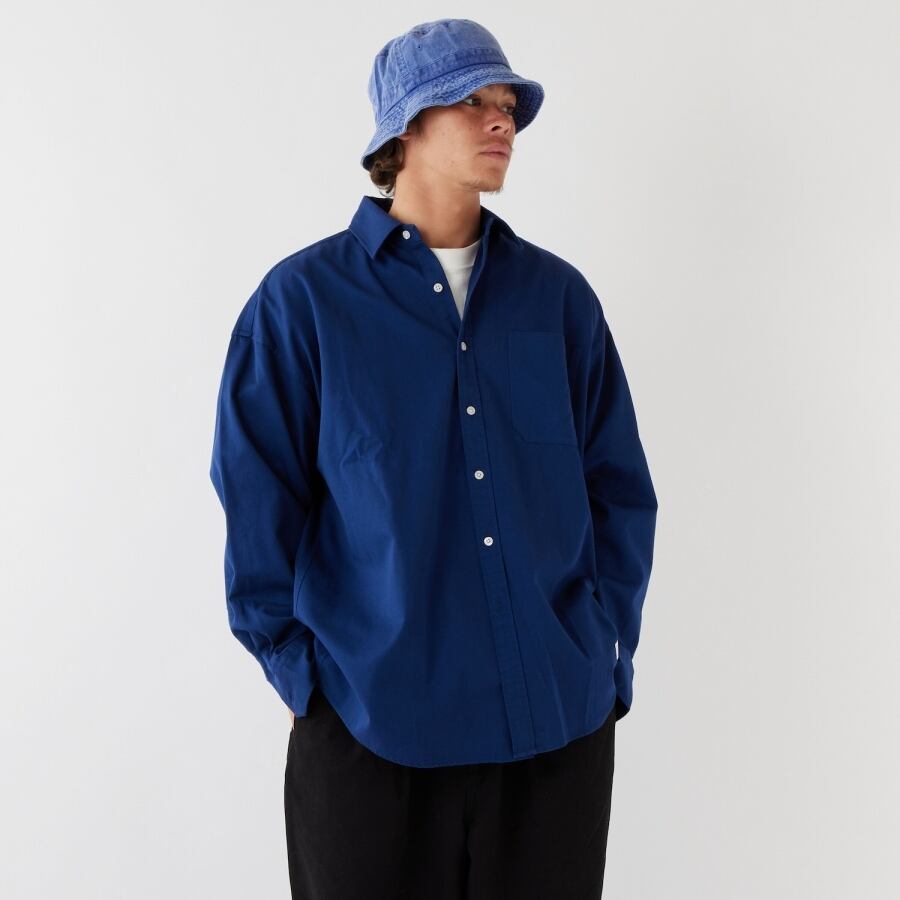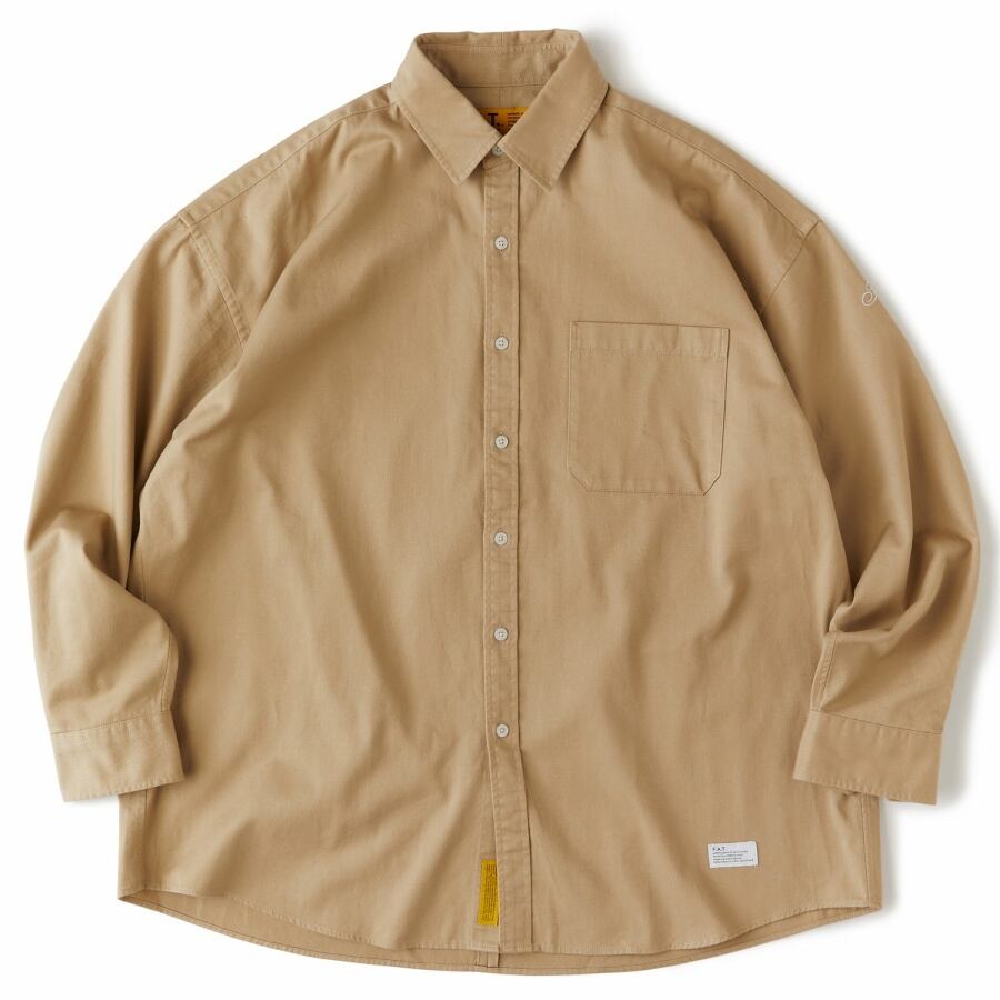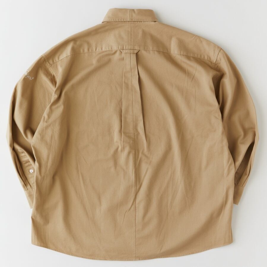 程よい肉感のコットンチノを使用し、洗い加工によりアタリ感を出した、通常よりも身幅・肩幅にゆとりをもたせたBIGシルエットシャツ。