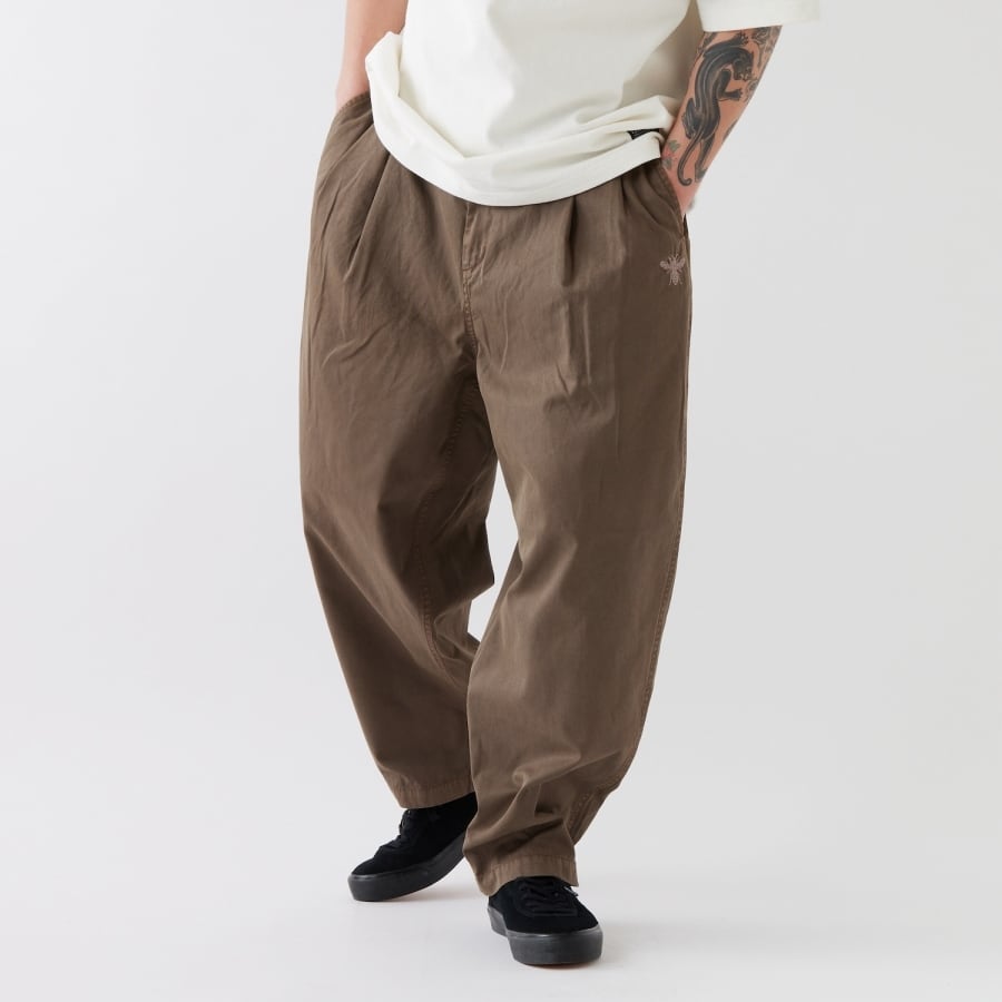 程よいハリ感のコットンギャバを使用し、ピグメント加工を施すことで、絶妙な色合いとアタリ感を表現したワイドパンツ。