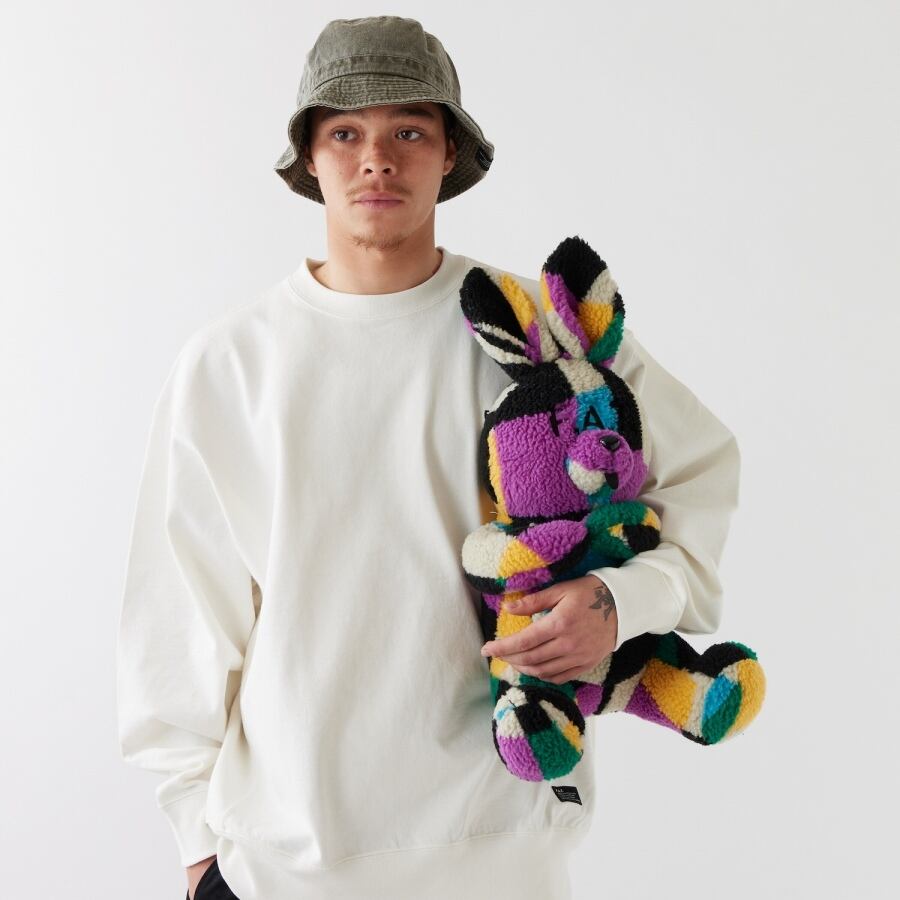 ラビットをモチーフとしながらも、あえて顔にロゴ刺繍を施すことでキャラクターとは一線を画す印象の仕上がりに。