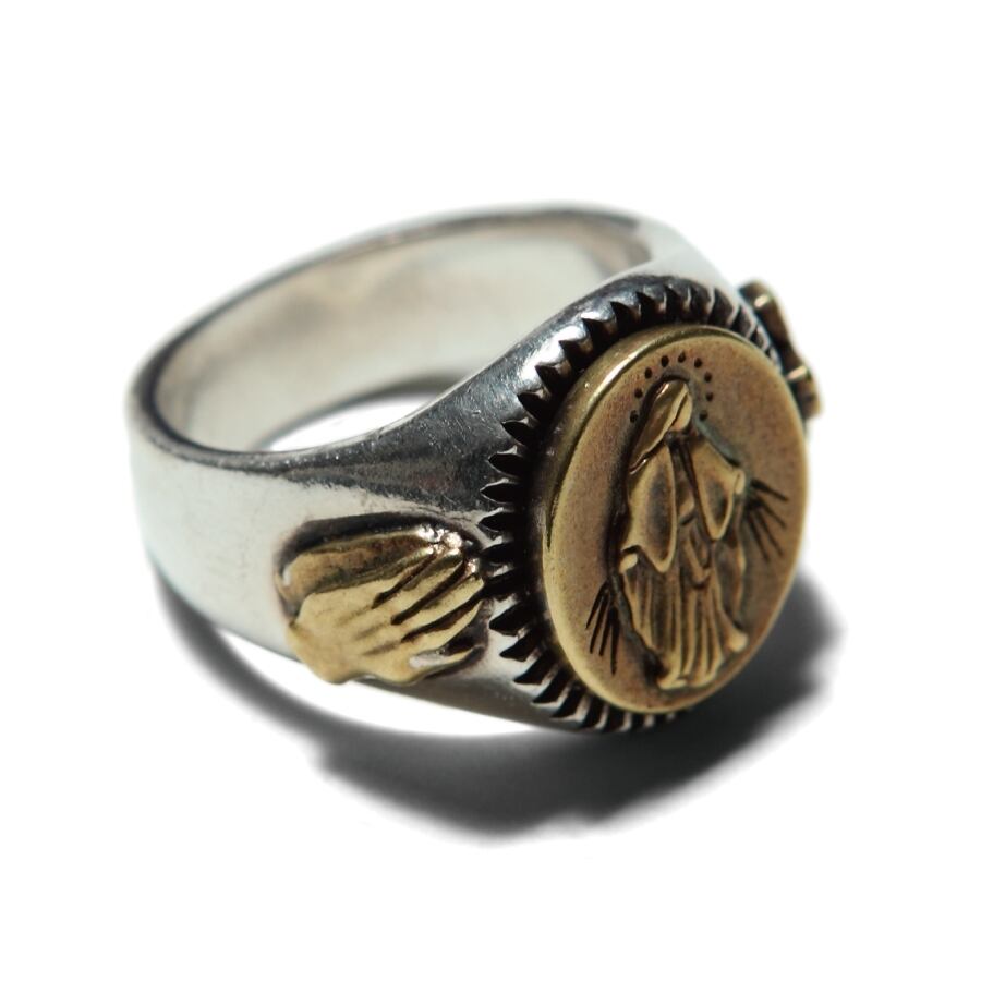 フロントのマリアとサイドのクロス、プレイハンドに真鍮を使用した、オリジナリティ溢れるシルバーリング。
