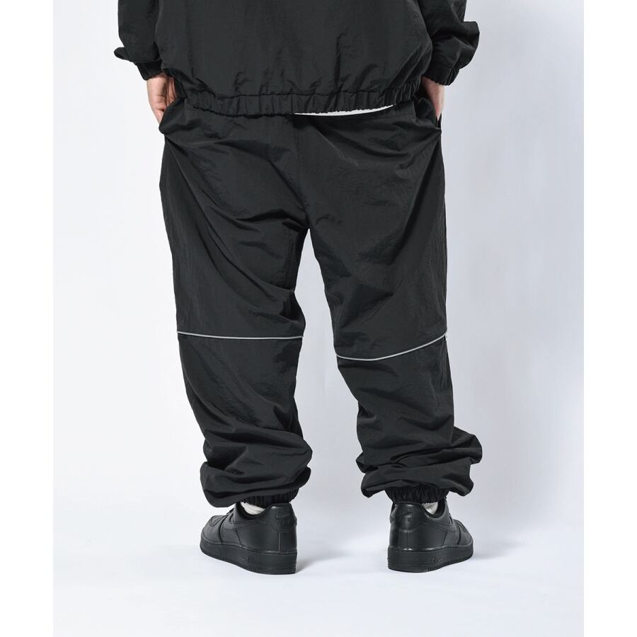 シャリ感のあるナイロン生地を使用したシンプルなトラックパンツで、背面の腿部分にリフレクターパイピングを配置。