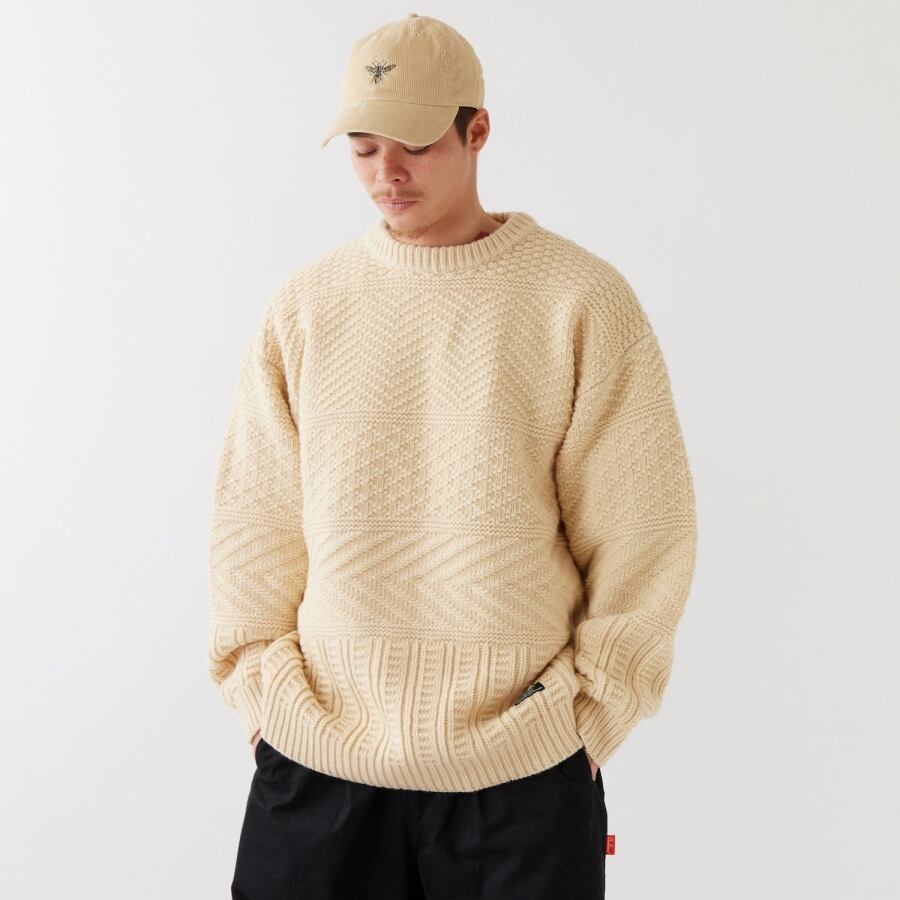 編み柄を切り替えることでボーダーパターンを表現したクルーネックニットは、ソリッドなカラーリングながらも編み柄の陰影がいつもとは違ったリラックススタイルを演出してくれる。