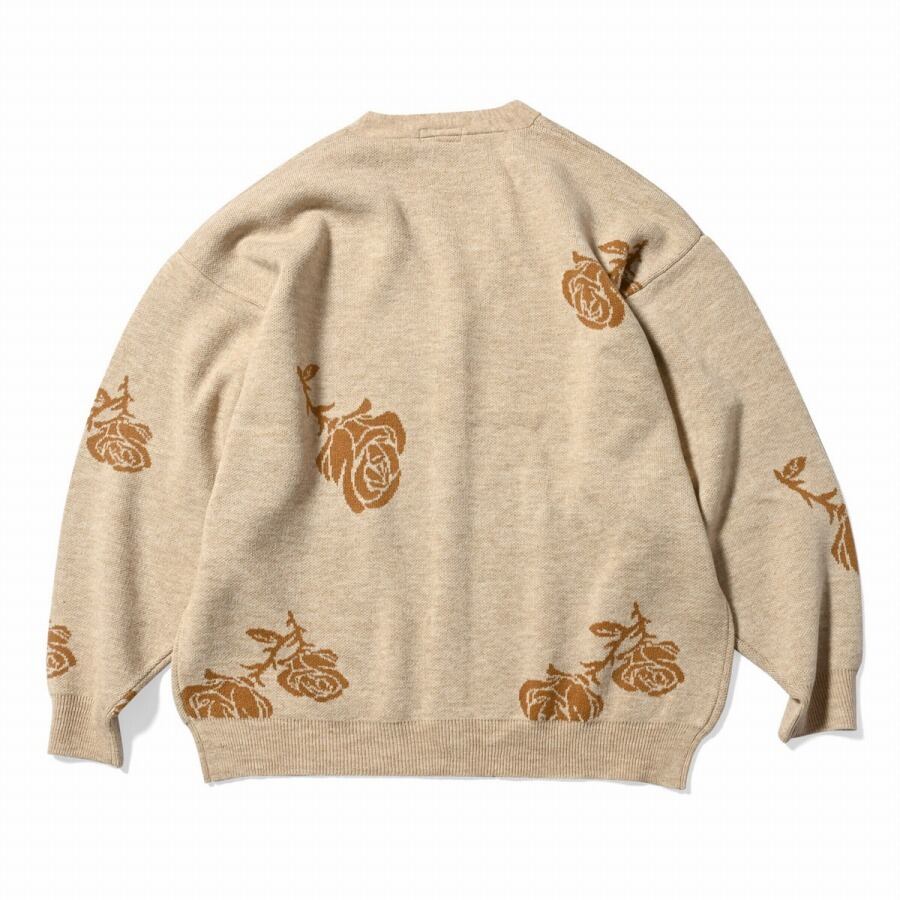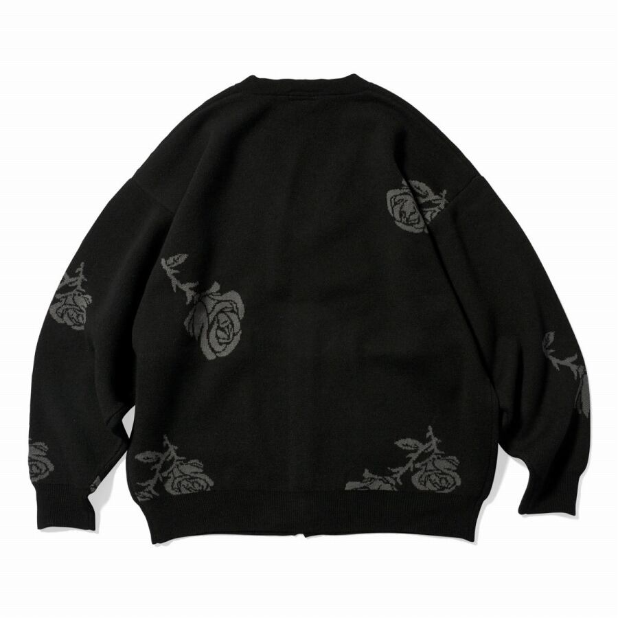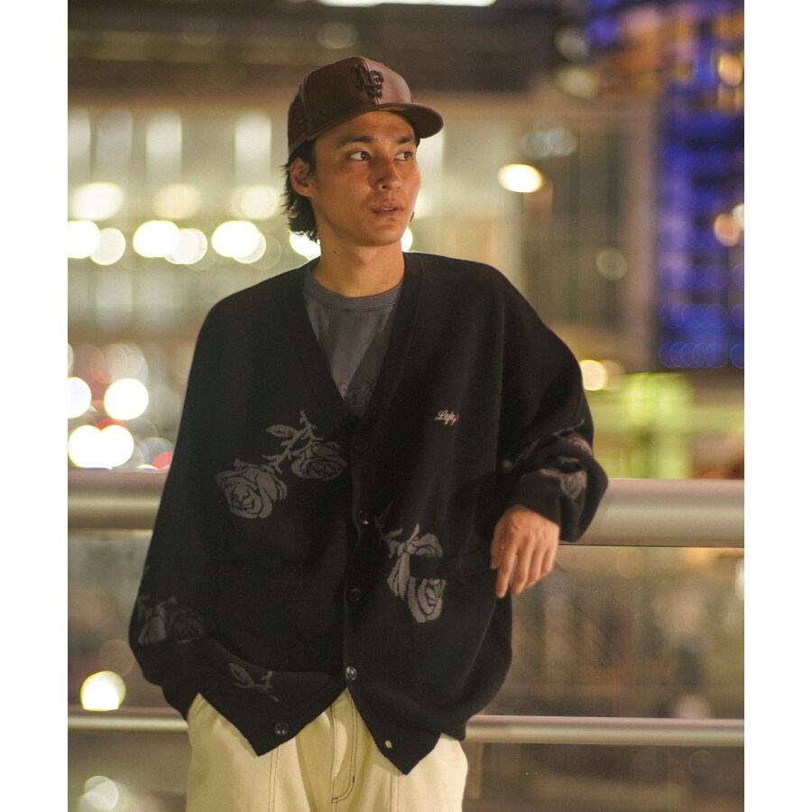 ジャガード織りでニューヨークの州花である「薔薇/ローズ」モチーフのパターンを全身に配したニットカーディガン。