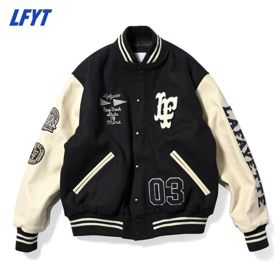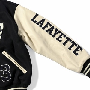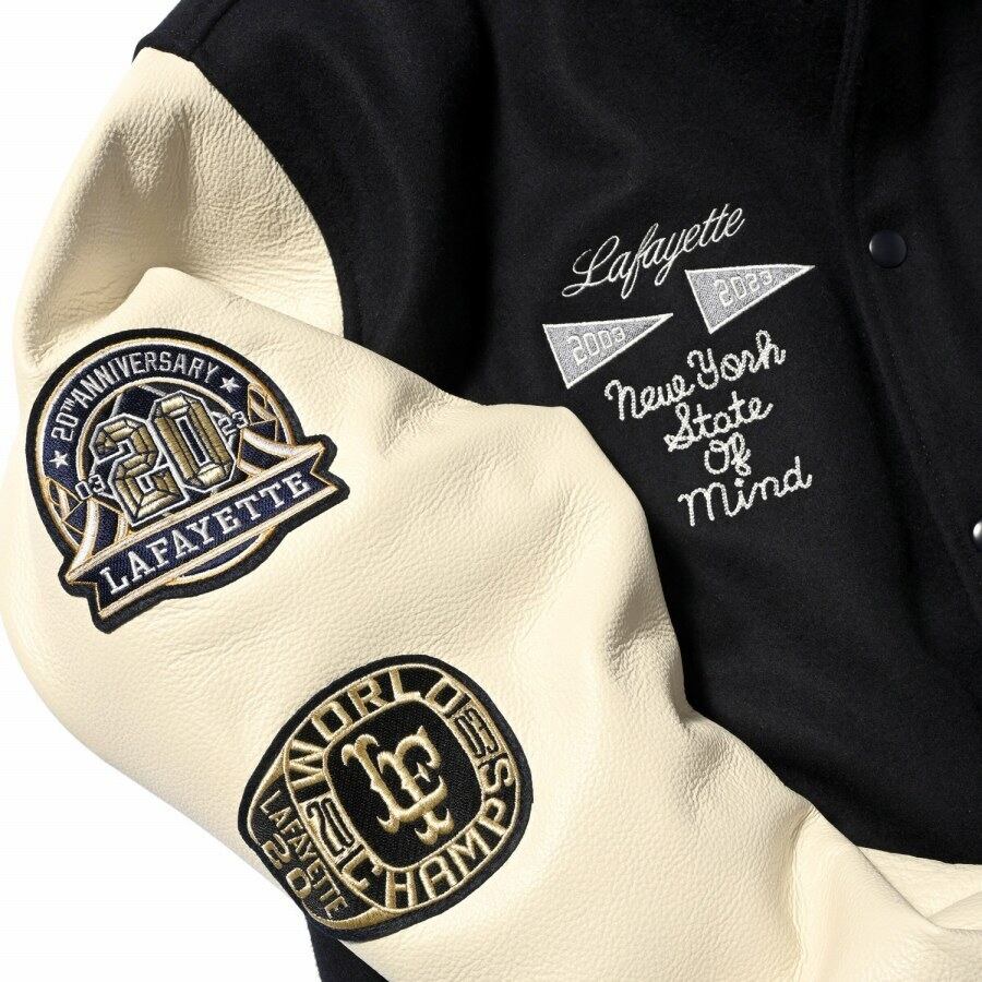 フロントの「LFロゴ」、左袖の「LAFAYETTEロゴ」、裾付近の「03」はサガラワッペン仕様、右胸のスクリプトとフラッグデザインは刺繍で表現。