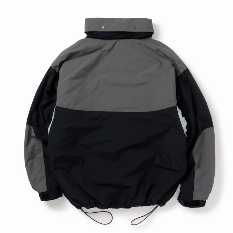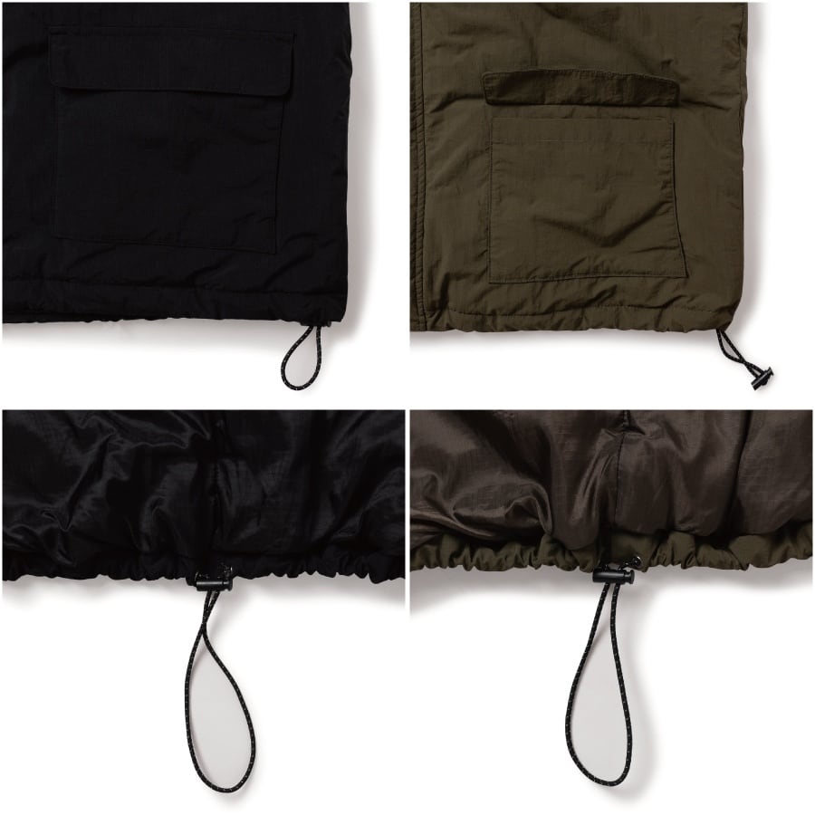 型は身幅やアームにボリューム感を持たせたオリジナルシルエットで、裾のドローコードを強めに絞ることで、90’s感溢れる幅広/ショート丈の丸いフォルムで着用可能。