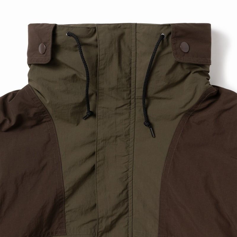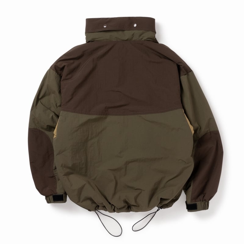 落ち着いた同系色切り替えのカラーリングが雰囲気良い中綿ジャケットは、表地にはマットな質感のナイロン生地を使用し、裏と中材にはポリエステル生地と樹脂製の軽量綿を使用。